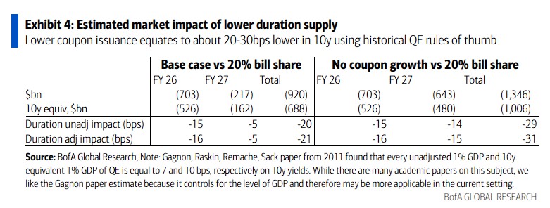 Based on calculations, in the fiscal years 2026 and 2027, a higher Treasury bill issuance scenario will reduce the 10-year equivalent supply by $700 billion to $1 trillion compared to the scenario where the Treasury bill proportion is reduced to 20%. This difference in supply structure will translate into a net easing effect of 20-30 basis points on the 10-year rate.