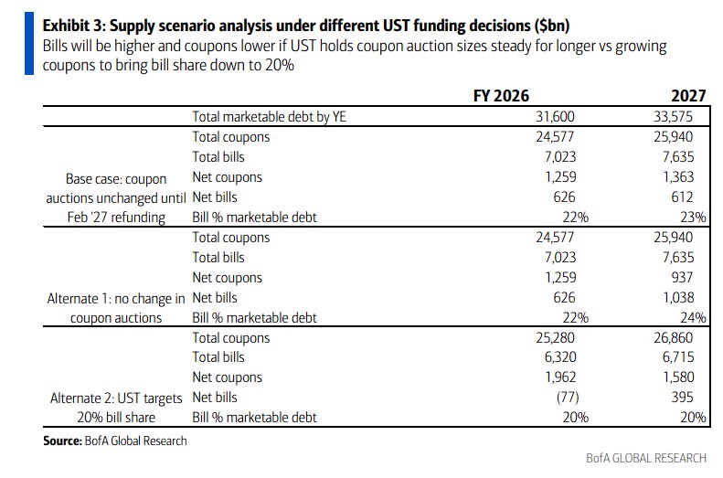 According to Bank of America's scenario analysis, under the baseline scenario, the Treasury will begin to increase the auction scale of 2-7 year bonds starting from the bond issuance meeting in February 2027. However, in an alternative scenario, if the Treasury continues to keep the auction scale of medium- and long-term bonds unchanged, or adopts a strategy to reduce Treasury bill supply to 20% of the long-term average level, the market impact will be significantly different.