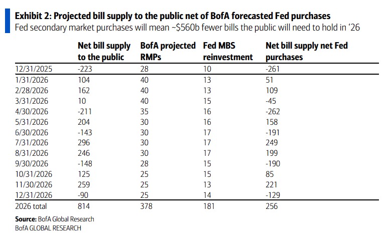The report states that the Federal Reserve began implementing the RMPs program this month. Although this is not traditional QE, it indirectly allows the Treasury to increase the issuance of short-term Treasury bills while reducing the supply of medium- and long-term bonds. Bank of America expects that by 2026, the Federal Reserve will purchase a total of $560 billion in Treasury bills through RMPs and MBS reinvestment, while the Treasury plans to issue an additional $500 billion in Treasury bills and reduce the issuance of medium- and long-term bonds by $600 billion.