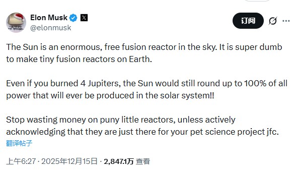 12 月 15 日,马斯克在 X 平台的一篇帖子中,毫不掩饰他对地球核聚变项目的蔑视。他写道:“太阳是天空中一个巨大、免费的聚变反应堆。在地球上制造微型聚变反应堆是愚蠢至极的。”