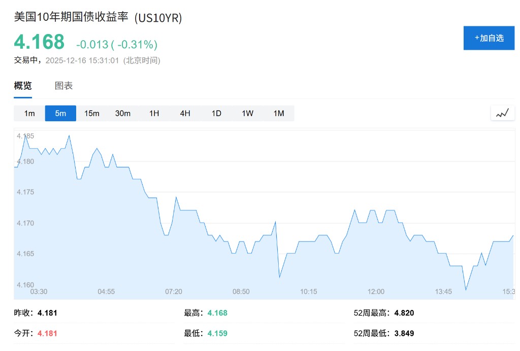 The yield on the U.S. 10-year Treasury bond stabilized around 4.17%. Despite inflation showing signs of stickiness, the market is still betting that the Federal Reserve will support the labor market through two rate cuts next year.