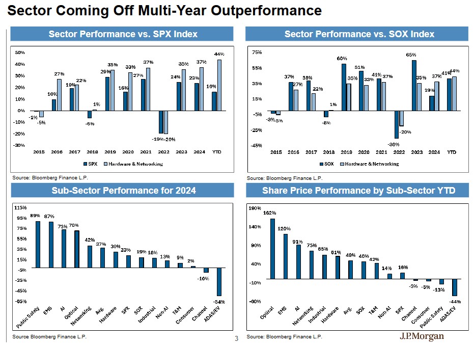 面对近期 AI 硬件股的回调,摩根大通硬件团队发出明确信号:投资者应坚持持有 AI 赢家股票,而非进行大规模轮换。更重要的是,该团队预计 2026 年"网络基础设施"板块的增长将超越"算力",这一结构性转变为投资者提供了新的机会窗口。