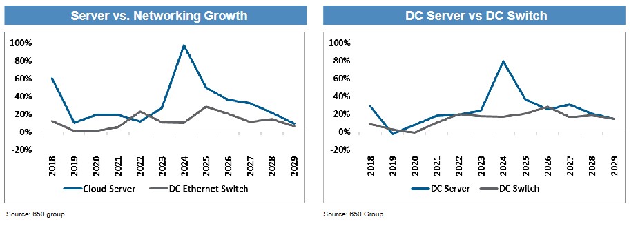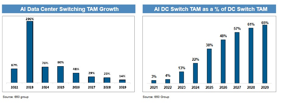 报告援引研究机构 650 Group 预测称,AI 交换机收入将在 2026 年增长 48%,2027 年增长 29%,2028 年增长 25%,相比之下,整体数据中心交换机行业的增长率分别为 23%、19% 和 18%。这表明 AI 正成为交换机行业增长的主要驱动力。