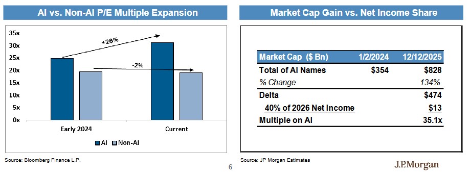 分析显示,AI 相关公司目前的估值溢价约为 26%,这一水平相对保守。该团队估算,AI 业务在 2026 年将占这些公司收入的约 40%,对应的市盈率约为 35 倍,这暗示市场仅预期 AI 相关的可持续资本支出增长 30%,远低于 2024-2025 年的 70% 增长率。