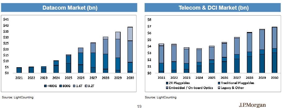 在光学互连领域,数据通信市场预计 2026 年将增长 40% 至 200 亿美元,并在 2030 年前保持 20% 的复合年增长率。电信和数据中心互连市场也将在 2026 年增长约 15% 至 50 亿美元。