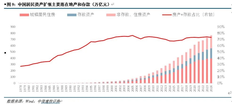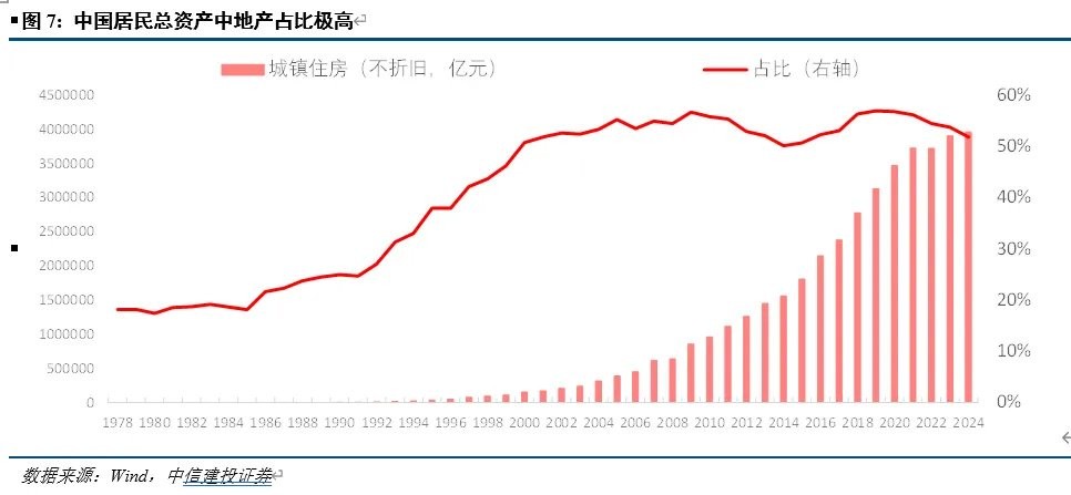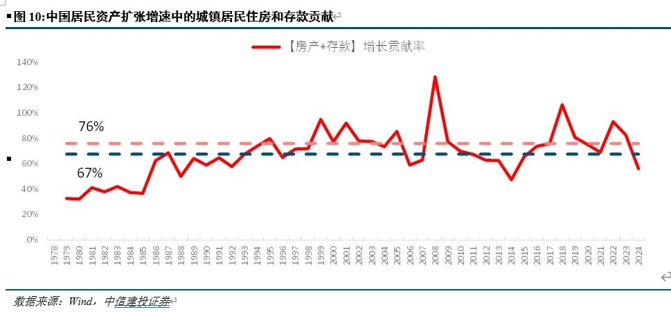 The first set of data shows that real estate has accounted for about 40% of the total assets of Chinese residents over the long term (from 1978 to 2024), and from 2000 to 2024, the expansion of real estate wealth explained 50% of the expansion of total assets for Chinese residents.