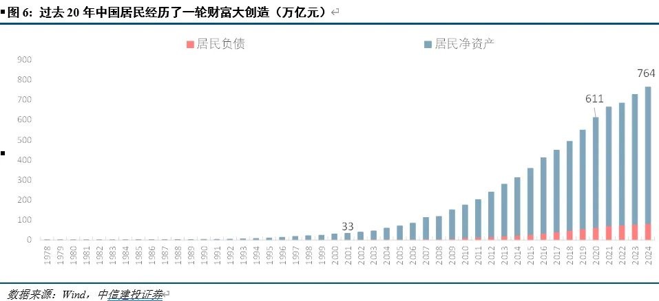 As of 2024, the total stock assets of Chinese residents are 763.7 trillion, of which real estate accounts for 395.6 trillion and deposits for 163.2 trillion; total liabilities of residents are 82.8 trillion, with a net asset scale of 680.8 trillion.
