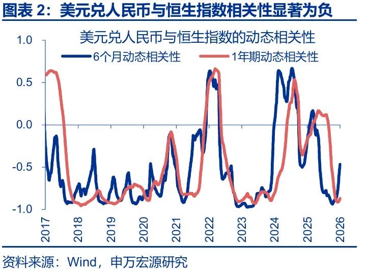 向后看,随着汇率与港股关系的逐步修复,2026 年,人民币升值有望再度成为港股上涨的助力之一。短期来看,年底获利了结交易结束后,港股年初的一月效应往往较为强劲。展望全年,随着 “待结汇” 逻辑的演绎、名义 GDP 的修复、中美贸易摩擦的边际降温,人民币的韧性有望延续。伴随着汇率升值 “重估效应”、“配置效应” 的逐步修复,如果人民币汇率与港股重回正相关关系,人民币升值有望成为宏观层面港股上涨的又一助力。