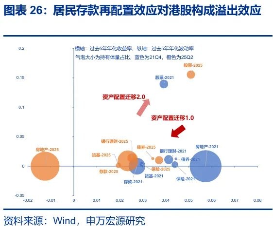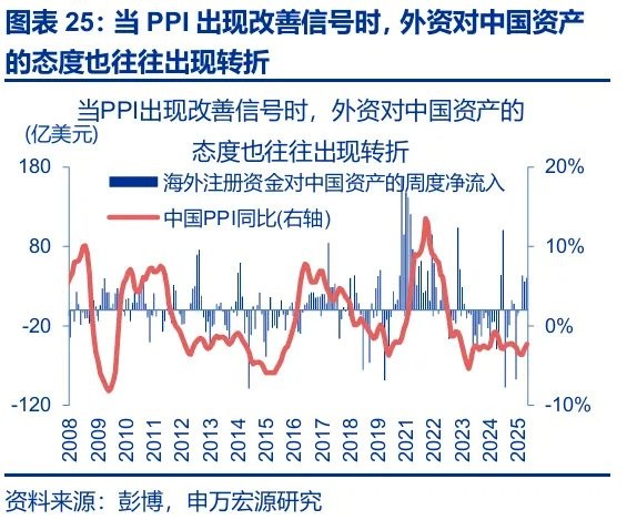 另一方面,人民币汇率升值对港股的 “配置效应” 也有望恢复:PPI 的回升有望继续吸引外资流入,居民存款再配置效应对港股也有溢出效应。1)在 “反内卷” 政策加码下,供给收缩的预期升温提振大宗商品价格,另一方面产能利用率的拖累在产能出清的影响下在明年亦有望逐步缓解,中国 PPI 在明年有望维持当前的改善态势。历史回溯来看,当 PPI 出现改善信号时,外资对中国资产的态度也往往出现明显转折。2)本轮潜在牛市,居民存款再配置有很大空间;多数情况下,内地投资者往往在 A 股赚钱效应明显扩散后,将战场转移至港股。