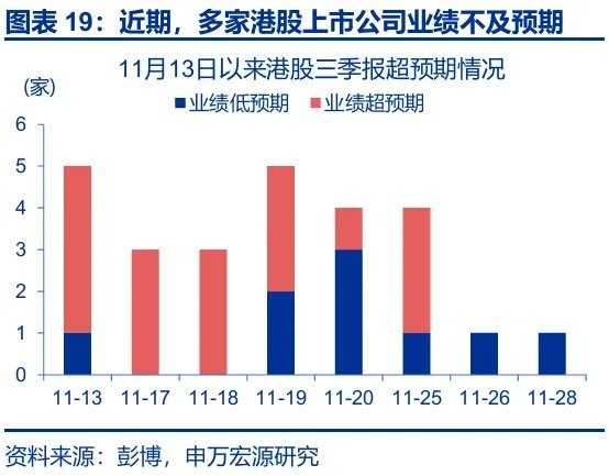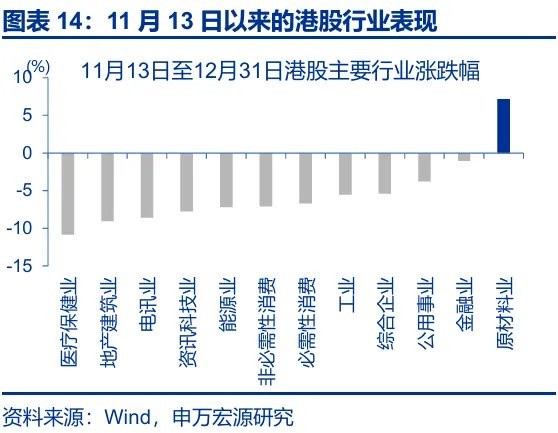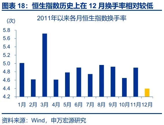 第二,港股 12 月交投平淡的季节性、海外投资者的获利了结、部分港股上市公司三季报不及预期等也有拖累。1)本轮汇率升值更多由外因驱动而非基本面改善,且时值年终,部分海外投资者的获利了结弱化了外资的 “配置效应”。2)历史回溯来看,2011 年以来,恒生指数 12 月的平均换手率为 4.4 次、为全年各月份最低。3)11 月 13 日以来,多家互联网平台企业、车企等三季报业绩不及预期,对市场情绪也有一定影响,一定程度上强化了获利了结交易的惯性。整体而言,四季度港股市场或以获利了结交易为主,市场整体交投清淡限制了港股对利好因素的即时反馈。