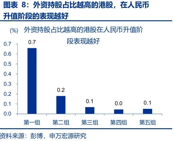 人民币升值时,港股盈利、资产的重估效应与外资的回流,或是港股上涨的主因。1)货币价值重估效应,内地公司是港股重要构成,这类公司盈利由人民币计价,当人民币升值时,公司赚取的人民币利润折算港币时数值会放大。2)资产重估效应,许多在港上市的地产股等,其底层资产以人民币计价,在升值时会面临价值重估。因而,账面价值越大的上市港股公司(PB 越低),在汇率升值时表现越突出。3)全球配置的比较效应,人民币汇率走强多指向中国基本面具有一定相对优势,这会令全球投资者配置更多中国资产。 因此,外资青睐的个股在升值时通常表现更突出。