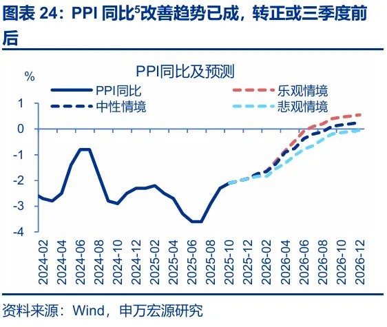 [5] 中性情境下,2026 年国际油价中枢或为 65 美元/桶,铜价保持高位,国内钢价低位震荡,国内煤价或有所上行;中下游方面,虽然民企占比较高、反内卷政策推进速率或偏慢,但也有望更稳健的推动中下游价格逐步走出通缩;预计 PPI 同比在明年 9 月转正。乐观情境下,若国际油价中枢为 75 美元/桶,国内反内卷进度推进较快,PPI 同比转正时点或在明年 7 月。悲观情景下,国际油价中枢回落至 55 美元/桶,国内反内卷推进进度较慢,PPI 同比转正时点或在 2027 年初。