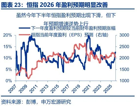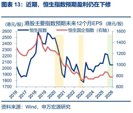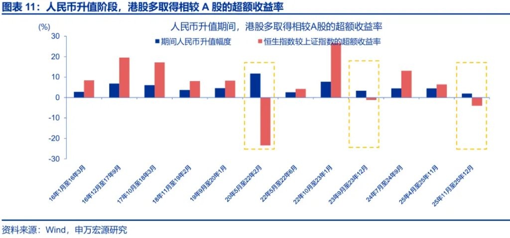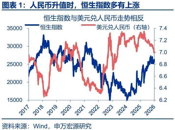 一方面,业绩表现是决定港股能否受益汇率升值 “重估效应” 的关键;申万策略此前发布的《从彼岸,到此岸——2026 年港股和海外中资股投资策略》中提到,2026 年港股盈利有望出现边际改善。