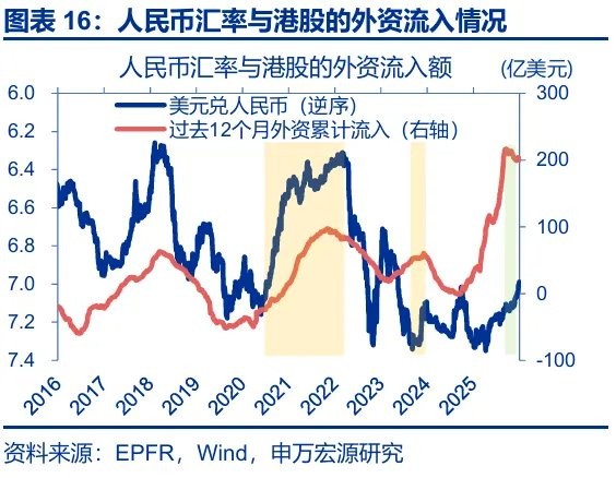 历史回溯来看,人民币汇率与港股有着显著的正相关关系。1)2016 年以来,港股与美元兑人民币的负相关系数高达-0.54;2025 年 11 月 13 日,美元兑人民币与恒生指数 6 个月、1 年动态相关性一度均走低至-0.88。2)2016 年以来,当人民币月涨(跌)幅超过 1.5% 时,恒生指数当月有 93.5% 的概率上涨(下跌);当人民币月涨(跌)幅位于 1-1.5% 时,恒生指数当月也有 78.9% 的概率上涨(下跌)。