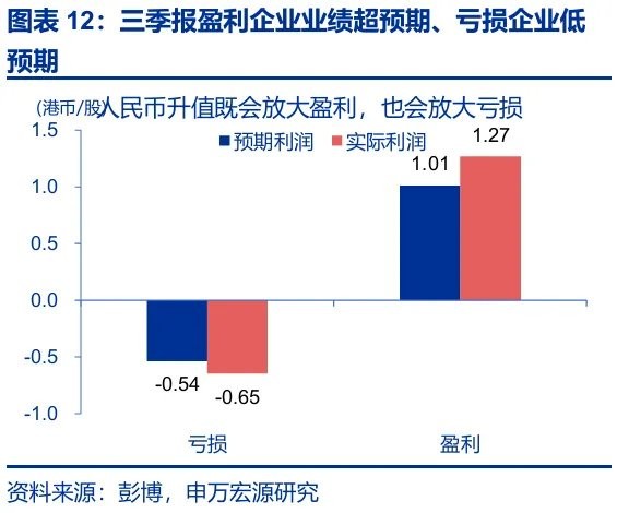 2、疲软的业绩影响下,重估效应、外资配置效应均未显现,或是人民币升值但港股不涨的原因。一方面,2025 年港股权重板块较弱的业绩表现,导致人民币升值对港股盈利放大作用较为有限。另一方面,12 月港股市场或以获利了结交易为主,市场整体交投清淡限制了港股对利好因素的即时反馈。二者并非互为 “影子”,而是国内基本面在不同资产维度的 “映射”。