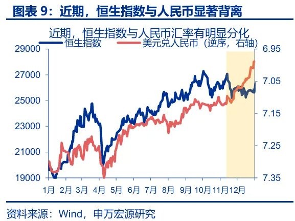 然而,近期人民币快速走强,港股却仍在走弱,二者间出现明显背离。11 月 13 日以来,在美元走弱、结汇潮缓缓开启的背景下,人民币汇率大幅走强;截至 12 月 31 日,美元指数快速回落 1.2%,人民币兑美元升值 1.9%;但港股却并未受到美元回落的提振,恒生指数、恒生中国企业指数、恒生科技指数分别下跌 4.8%、6.6%、7.0%,与人民币汇率表现显著背离。这一现象在历史上并不多见,2016 年以来的 12 次人民币升值阶段,仅 2020 年 5 月至 2022 年 2 月、2023 年 9 月至 12 月以及本轮,出现了人民币汇率与港股走势的背离,其他 9 次中港股均显著跑赢 A 股。