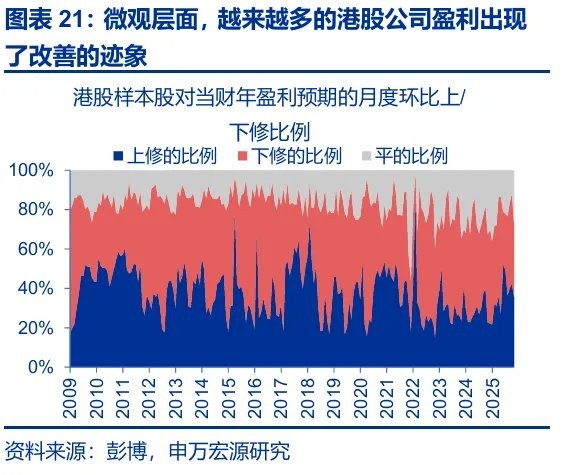 1)表面上,2025 年港股指数层面的盈利预期在中报后明显下行,但其背后主要由部分大型平台类企业拖累,且这一趋势在中报之后并未出现线性下滑。2)若以盈利预期修正宽度来看,以我们追踪的五百余家港股公司样本股来统计,当前财年盈利预期上修公司占比自今年年初以来处于明显的上行趋势中,越来越多的公司盈利出现了改善的迹象。3)历史回溯来看,“下一财年盈利同比增速向上 + 当前财年盈利预期向下” 这一组合往往是盈利预期改善的前瞻信号 。叠加 2026 年相关权重板块的盈利有望在低基数效应下明显修复,盈利有望成为 2026 年港股市场上行的重要驱动力。