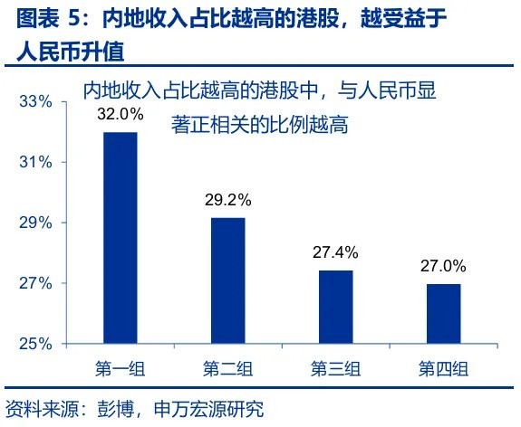 [1] 为验证这一逻辑,我们将所有港股按照中国内地收入占比由高到低划分为 4 组,海外占比高的第四组中,仅 27.0% 的公司股价与人民币显著正相关,而内地收入占比高的第一组则高达 32.0%。