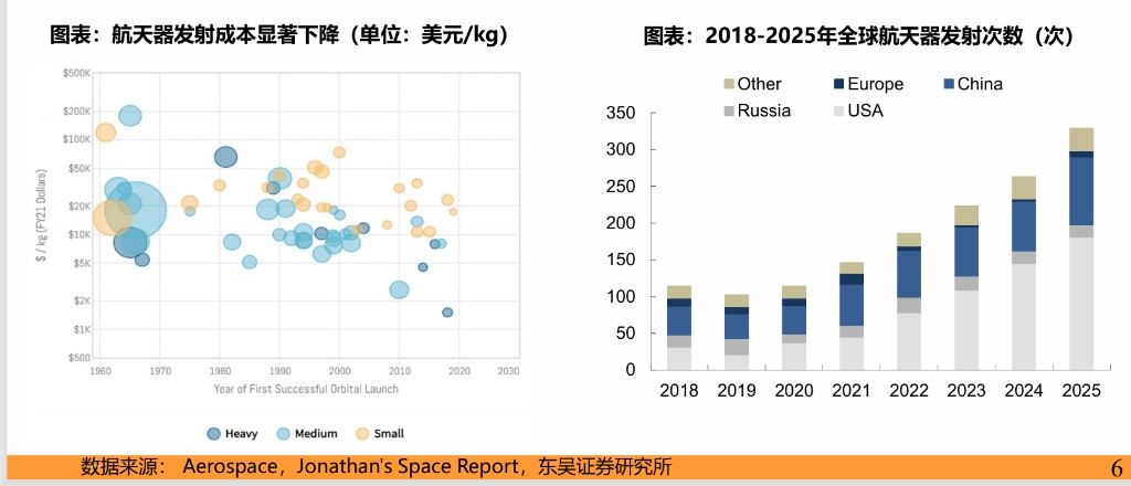 东吴证券表示,商业航天的快速崛起,核心动力在于运载成本的指数级下降。可回收火箭技术的成熟彻底打破了进入太空的经济壁垒,SpaceX 猎鹰 9 号的发射成本已降至约 1400-1800 美元/公斤,远低于传统航天发射。成本红利推动全球航天发射活动进入 “指数级” 增长周期,2025 年全球航天器发射次数预计超 300 次,较 2021 年实现翻倍。