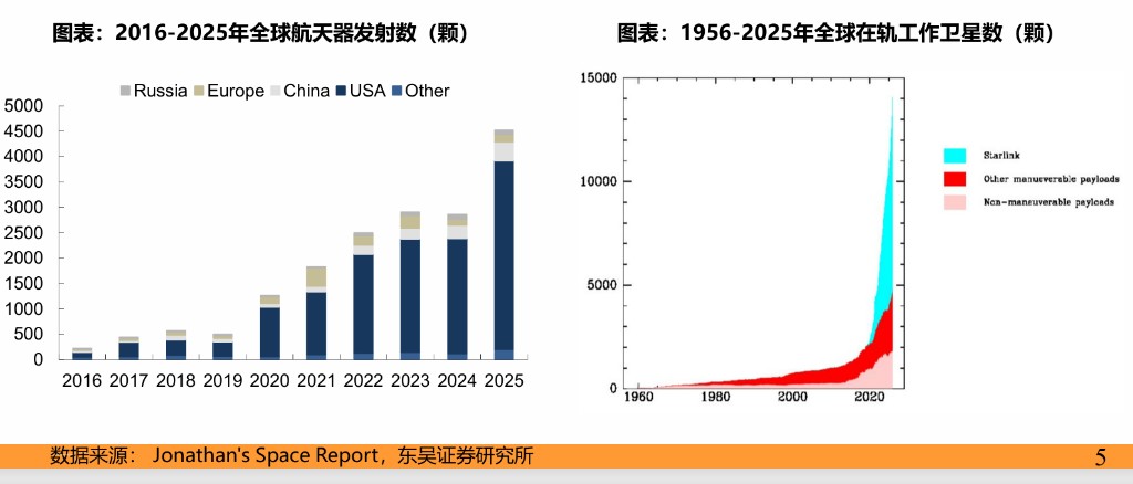 据东吴证券曾朵红团队 6 日发布的行业深度报告,2025 年全球航天器发射数量超过 4300 颗,同比增长超 50%,近十年复合增速达 34%。在国际电信联盟(ITU)频轨资源 “先登先占” 的规则驱动下,全球低轨卫星部署进入爆发期。