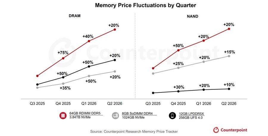 存储市场已进入 “超级牛市” 阶段,其涨幅超过了 2018 年的历史峰值。在人工智能和服务器容量持续旺盛的需求推动下,供应商的定价权已达到历史最高水平。根据韩国 Counterpoint Research 近期发布的《内存月度价格追踪报告(2026 年 1 月)》,** 预计 2025 年第四季度内存价格将上涨 40% 至 50%,2026 年第一季度将再上涨 40% 至 50%,2026 年第二季度还将进一步上涨约 20%**。