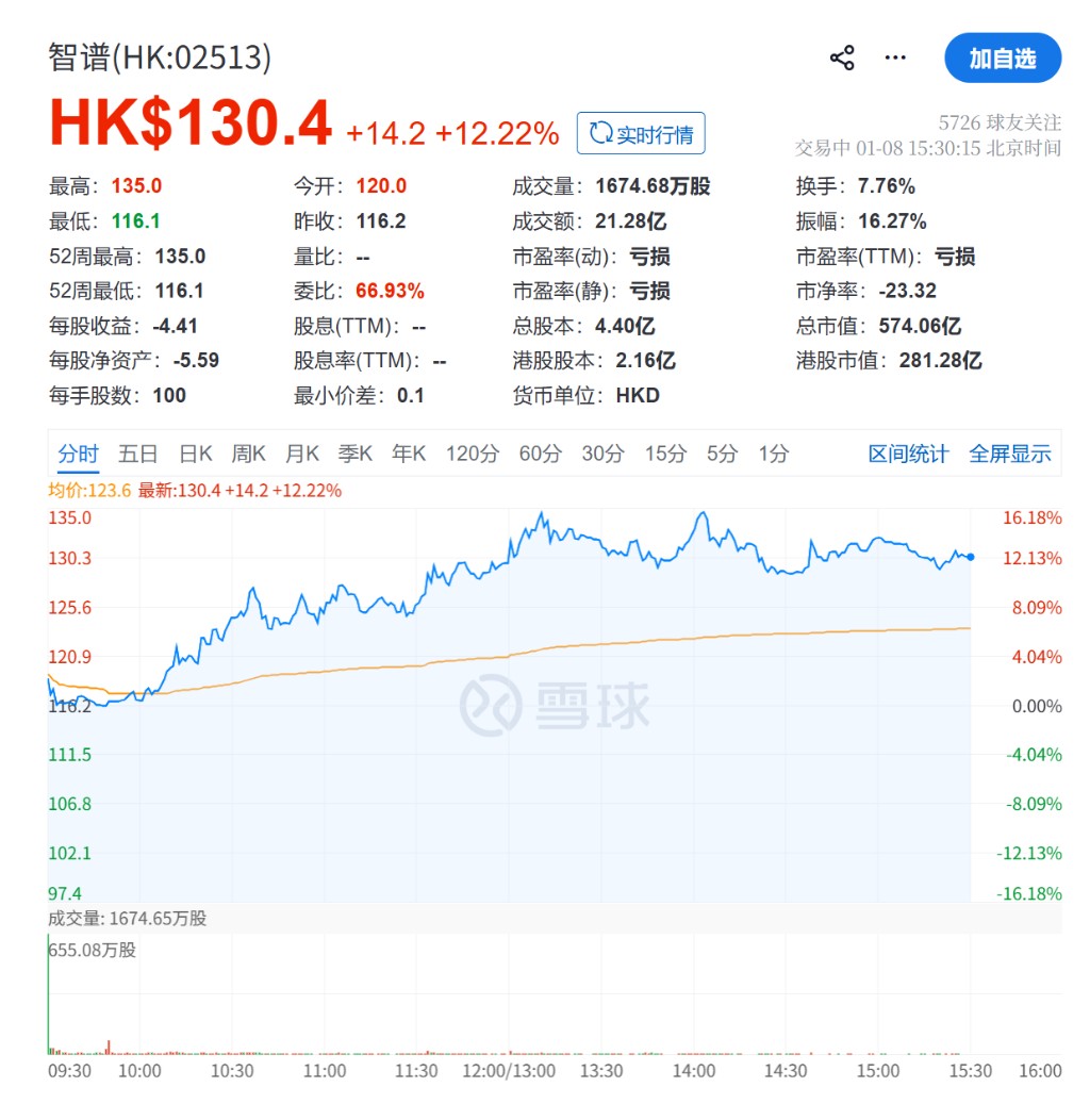 On January 8, KNOWLEDGE ATLAS was officially listed on the main board of the Hong Kong Stock Exchange, with an issue price set at HKD 116.2. Although the stock price briefly fell below the issue price at the opening, it quickly rebounded and turned positive, rising over 10% at one point during the trading session. As of the time of publication, KNOWLEDGE ATLAS's stock price was HKD 130, up 12%, with a total market capitalization of HKD 57.4 billion. The public offering portion of this IPO was oversubscribed by more than 1,159 times, demonstrating the high enthusiasm of retail investors for this rare AI target, while the international offering portion was also oversubscribed by over 15 times.
