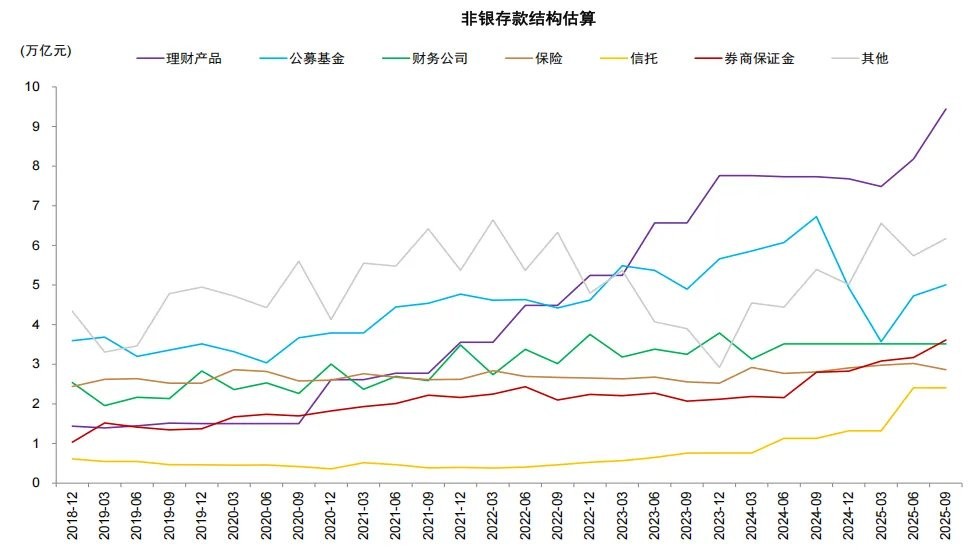 Another commonly used market indicator for observing the movement of deposits into the stock market is the growth of non-bank deposits. We observe that the growth of non-bank deposits correlates with stock market performance, but they do not move in lockstep, mainly due to other interfering factors affecting non-bank deposits. As of the third quarter of 2025, the margin of listed securities firms accounted for only about 11% of non-bank deposits, with the highest proportion of institutions in non-bank deposits being bank wealth management (29%), public funds (15%), finance companies (11%), and insurance (9%); the main contributor to the growth of non-bank deposits in the first three quarters of 2025 was bank wealth management (37%), rather than securities firm margins, primarily due to a preference for stable income interbank deposits in a volatile bond market environment. Nevertheless, non-bank deposits, as a high-frequency indicator for monitoring the movement of deposits, still hold reference value, but it is necessary to distinguish their influencing factors Chart 12: Recent increase in non-bank deposits mainly due to wealth management and public fund allocation