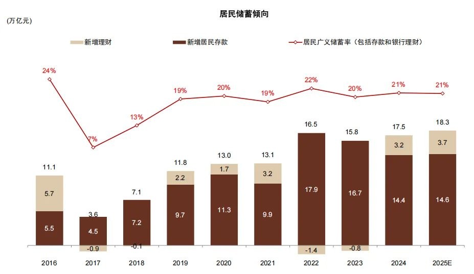 How to measure the potential for deposit migration? Compared to the market's focus on the narrative of deposit maturity, we believe that it is more critical to comprehensively consider "excess savings" from both household deposits and wealth management. We use the annual household savings/disposable income to calculate the savings rate, considering savings that exceed the long-term trend level as "excess savings." According to our calculations, from 2022 to 2025, households formed approximately 6 trillion yuan of excess savings, and the household savings tendency in 2025 remains around a high level of 21%, indicating that although the capital market is recovering, the marginal tendency for household investment and consumption has not significantly increased overall. Therefore, we believe that the current market narrative of "deposit migration" does not imply a substantial change in household risk preference, but rather reflects a marginal adjustment in asset allocation in a low-interest-rate environment.