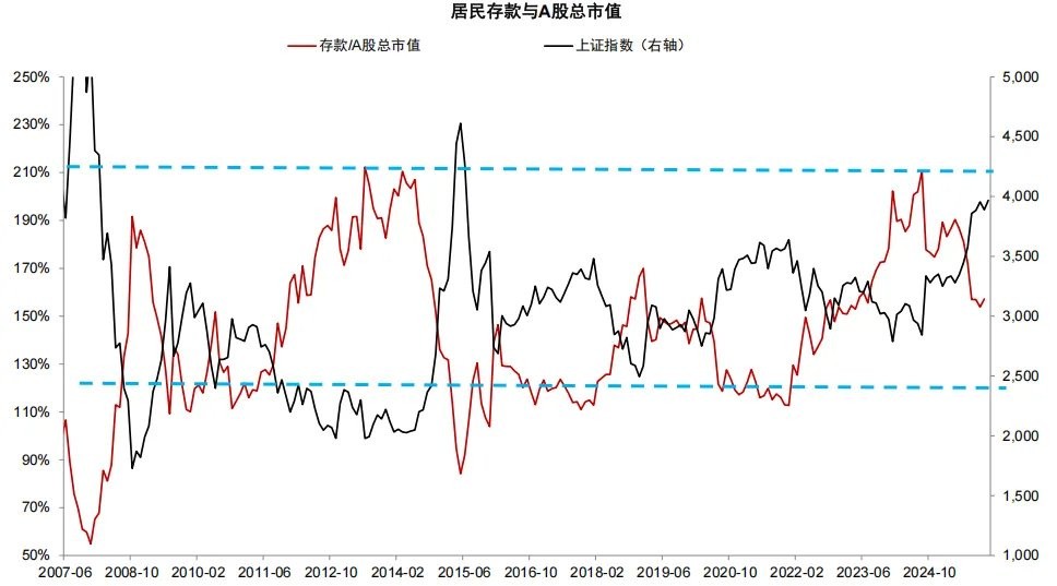 The market's expectation for the migration of deposits also comes from historical experience: 2017 and 2021 serve as typical examples of excessive savings consumption and the migration of deposits into the stock market. Can this be replicated in 2026? We believe that the similarity between 2026 and 2017/2021 lies in the fact that residents accumulated a considerable amount of excessive savings in a low-interest-rate environment, with the ratio of deposits to market value at a relatively high level.