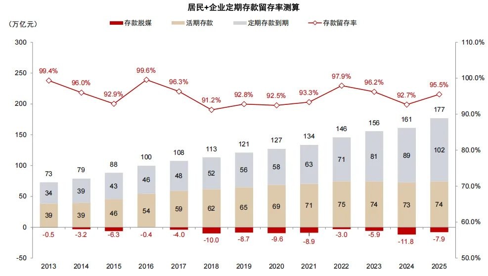 The maturity of deposits does not necessarily mean deposit migration; in fact, due to the stability of residents' risk preferences and the demand for liquidity management, the vast majority of deposits still remain within the banking system. We introduce the concept of a generalized deposit retention rate, calculated as 1 - deposit disintermediation / (maturity scale of deposits + balance of demand deposits) to measure the retention ratio of deposits in the banking system; financial disintermediation is estimated by the difference between the creation of real deposits and actual net increases, representing the net flow scale of real deposits to non-bank products. The results show that in most years, the bank deposit retention rate is above 90%. In certain years, such as 2024, due to the migration of deposits to wealth management products and bond funds, the deposit retention rate dropped to around 93%, while in 2025, the deposit retention rate remained high at 96%. In the past five years, the scale of financial disintermediation has fluctuated between 3 to 12 trillion yuan, representing the actual impact scale of "deposit migration" on the financial market.