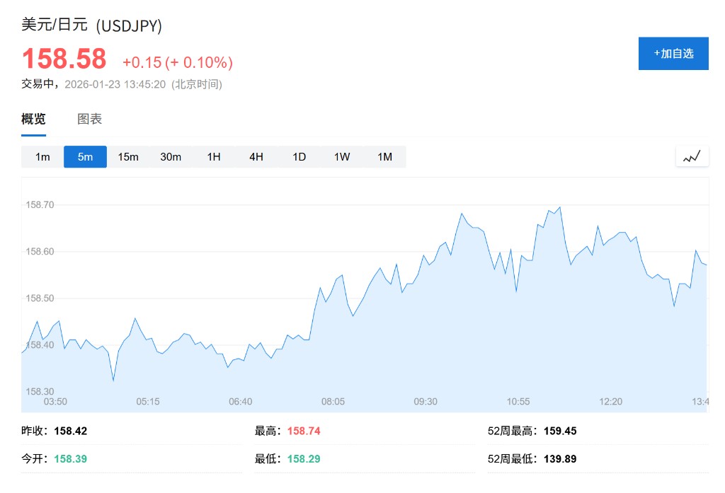 1 月 23 日,日本央行如期维持基准利率在三十年高位不变,决议公布后日元对美元一度跌 0.2% 至 158.74。