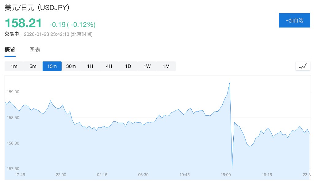 1 月 23 日,日央行维持政策利率不变,但上调经济增长预期并释放出未来可能进一步加息的信号。然而,这一偏鹰派立场并未能阻止日元走软,美元兑日元一度逼近 160 的关键心理点位,随后汇率突然大幅上涨,引发了市场对官方干预的广泛猜测。财政大臣片山皋月对此未正面回应。