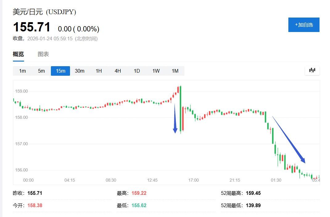 The first wave of the yen's rise occurred in the early European trading session, where the dollar against the yen previously rose to 159.23, breaking above 159.00 for the first time since January 14. It then plummeted, quickly dropping below 157.50 within about ten minutes, a decline of nearly 0.6% for the day, and continued to trend downward. During the U.S. stock market's midday session, the yen experienced a second, more intense surge, erasing losses since last Christmas, with the dollar against the yen accelerating its decline to 155.63, refreshing the low since December 24 of last year.