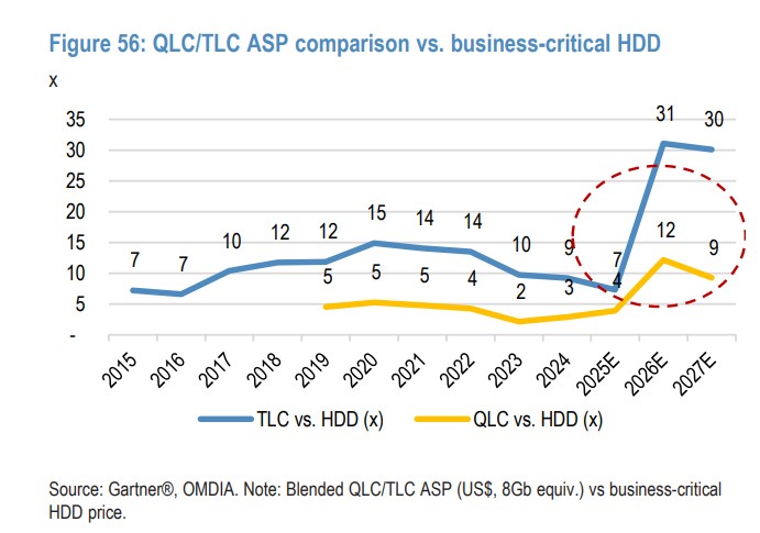 面对 HDD 的缺货,数据中心客户别无选择,只能转向 NAND Flash。这就给了 QLC(四层单元闪存)绝佳的上位机会。