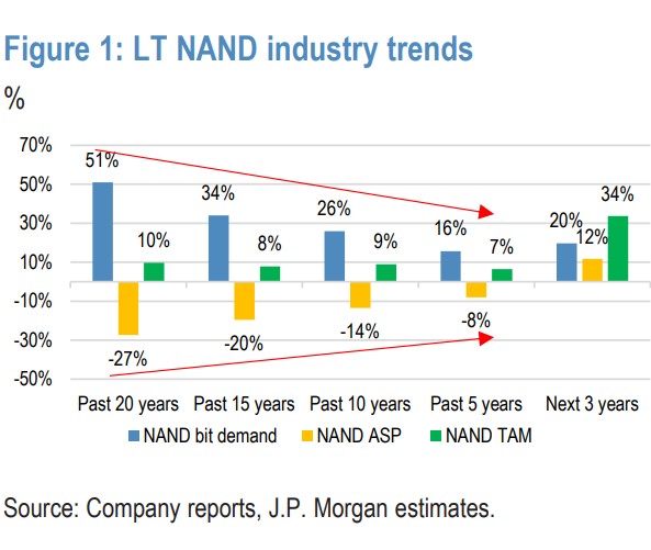 摩根大通复盘了过去 25 年的数据发现,无论是过去 20 年、15 年还是 5 年,NAND 行业的 TAM(潜在市场规模)年均复合增长率(CAGR)始终徘徊在 7%-12% 的区间内。