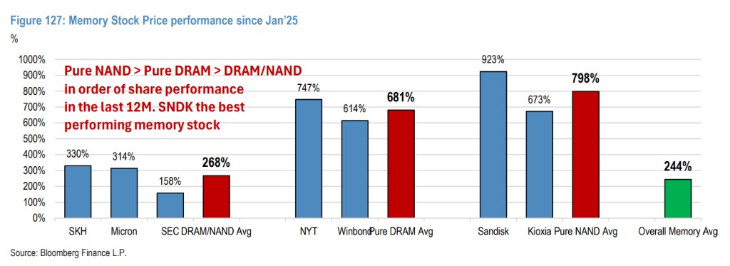 图注:自 2025 年 1 月以来,存储股虽然普涨,但纯 DRAM 和纯 NAND 标的的表现开始分化。摩根大通认为纯 NAND 标的(如铠侠)将在接下来的周期中展现更强弹性。
