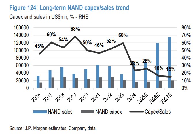 数据显示,未来三年 NAND 行业的资本开支(Capex)占销售额的比例将降至 15%-16% 的水平。作为对比,过去十年这一比例常年维持在 30%-50%,2018 年甚至达到过 68% 的峰值。