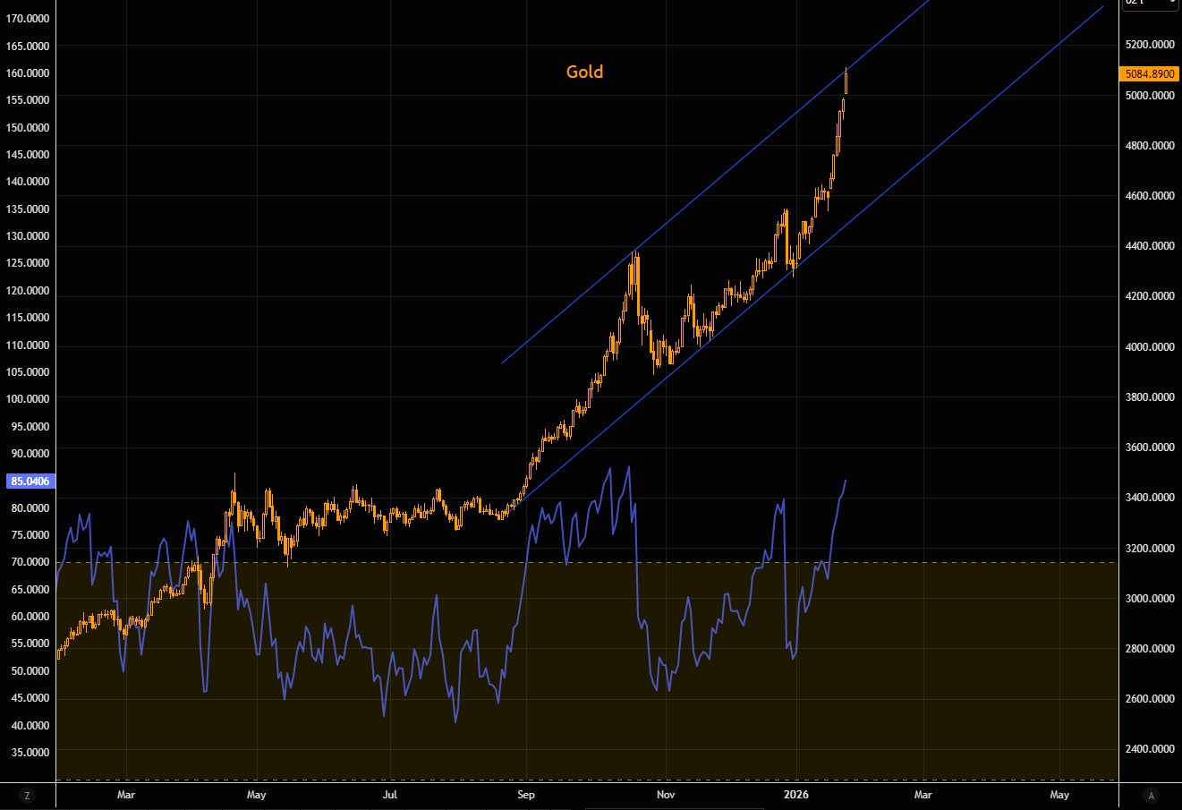 最近的这波抛售潮带来了类似的约 30% 的涨幅,金价再次触及了同一通道的顶部。动能已然过剩:相对强弱指数(RSI)已接近超买水平,尽管仍略低于 10 月峰值时的极端值。