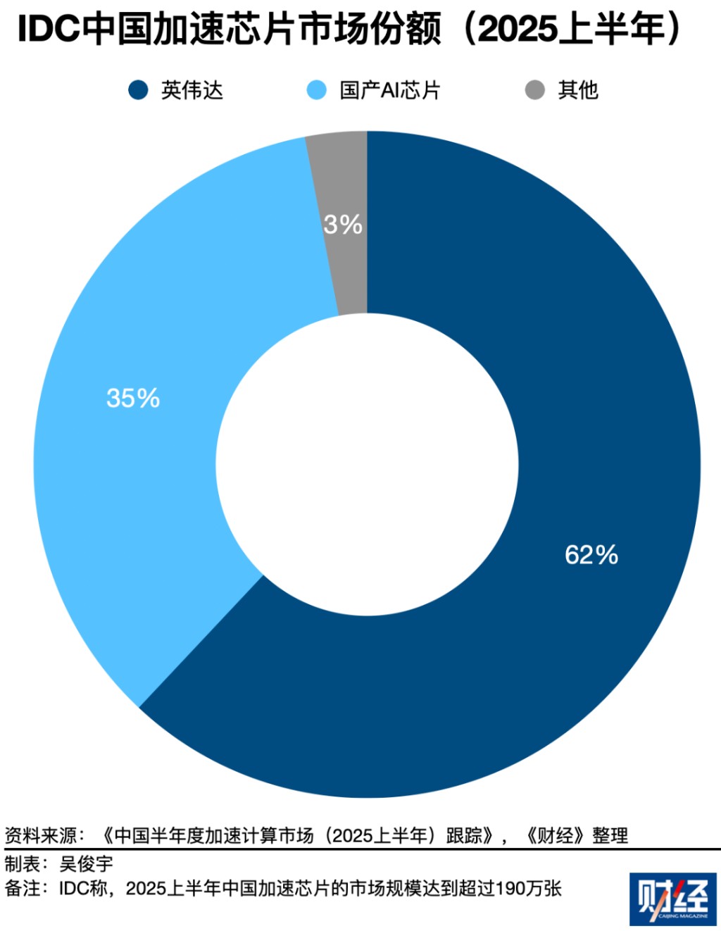 国际市场调研机构 IDC 2025 年 10 月数据显示,2025 年上半年中国加速(即 AI 芯片)服务器市场规模达到 160 亿美元,出货超过 190 万张。其中英伟达约占 62% 市场份额,国产 AI 芯片约占 35% 市场份额。国产 AI 芯片需求持续增长,增长速度远超英伟达。
