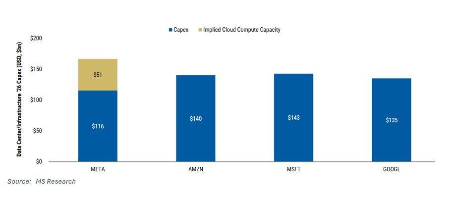 摩根士丹利对各家公司 2026 年资本开支的预期显示,科技巨头正在进行史无前例的投资扩张。