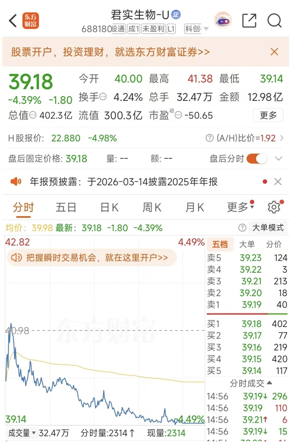 君实生物 A 股今日下跌 4.39%,收报 39.18 元/股。