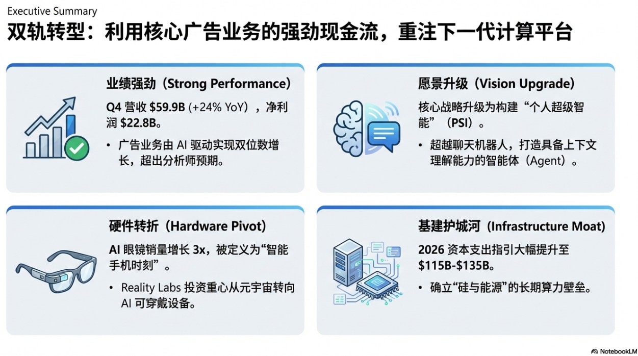 在随后的电话会,释放出一个清晰信号:Meta 在 2025 年交出强劲业绩的同时,正在把下一阶段的增长逻辑从 “更好的广告系统” 升级为 “以个人超级智能为核心的产品与基础设施重构”。