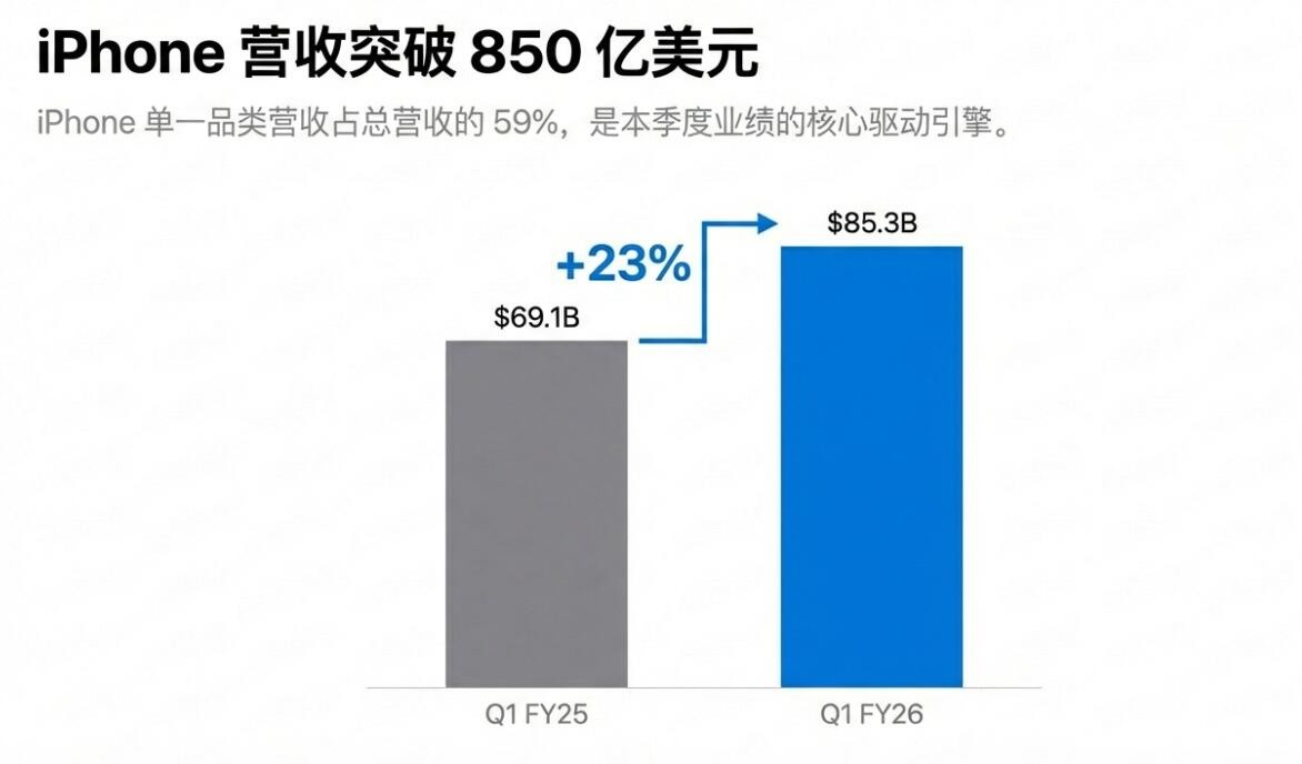 硬件产品中,iPhone 四季度营收 852.7 亿美元,将近占总营收的六成,成为整体增长的最大引擎,23% 的同比增速几乎为三季度增速的四倍,远超分析师预期的 783.1 亿美元,无愧于苹果所说的 “有史以来最佳” iPhone 季度表现。