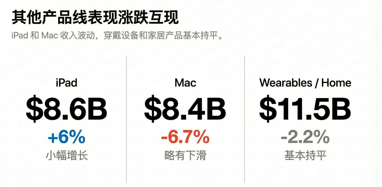而 Mac 和可穿戴设备均表现逊色。四季度 Mac 收入近 83.9 亿美元,同比下降近 6.7%,较分析师预期 91.3 亿美元低逾 8%,分析师预计同比增约 1.6%。