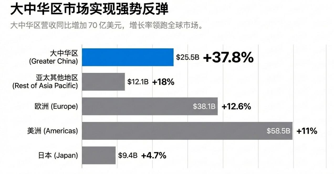 分区域市场看,四季度大中华区成为亮点,成为当季苹果收入增长的重要贡献市场。