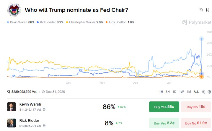 预测市场 Polymarket 最新显示,美联储前理事 Kevin Warsh 被特朗普提名为美联储新主席的概率飙升至 86%。据媒体最新报道特朗普政府正筹备提名沃什出任美联储主席。据德银分析沃什若当选美联储主席,其政策主张可能呈现"降息与缩表并行"的独特组合。