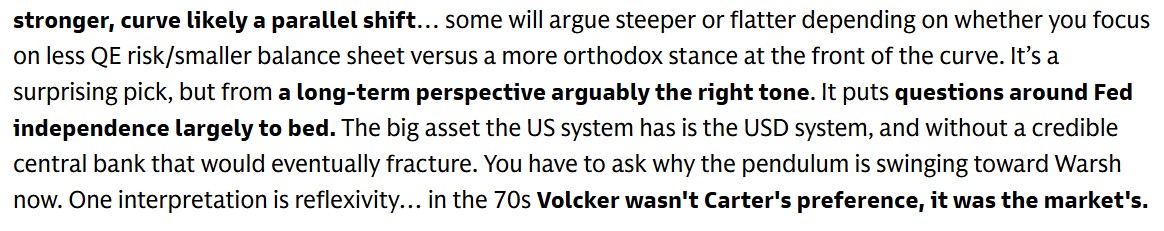 由于沃什长期以来的 “降息 + 缩表” 的政策立场,市场对沃什的理解是偏鹰派的。这一任命直接击沉了近期几乎九十度暴涨的金银。 高盛的 Rich Privorotsky 认为: 美国体系最大的资产是美元体系,如果没有一个可信的央行,最终会崩溃。 ……70 年代 ,沃尔克也并不是卡特的首选,而是市场的选择。