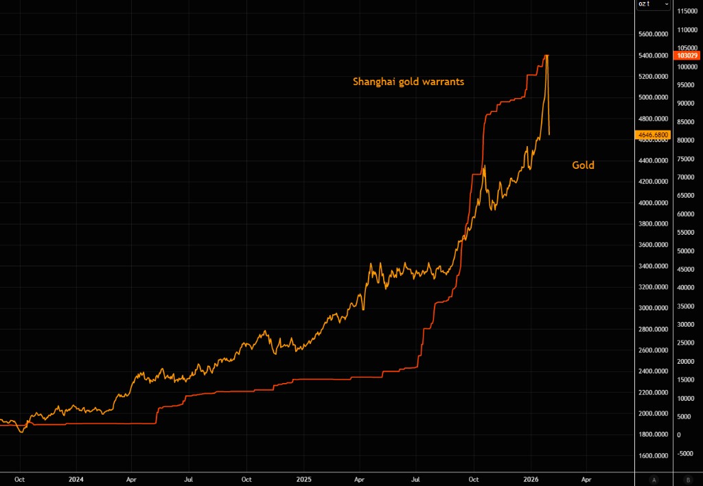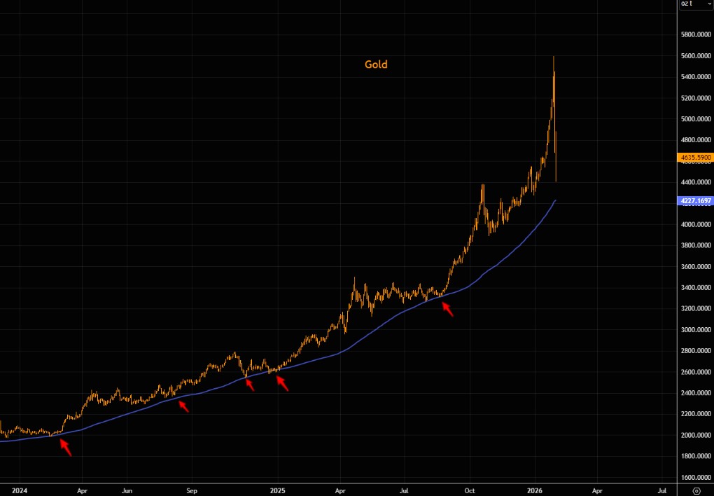 黄金正面临自 2024 年牛市开启以来最关键的技术测试之一。在经历了一轮由过度拥挤的动量交易引发的剧烈抛售后,金价已回落至去年 9 月以来的陡峭趋势线附近,并在夜间的迷你闪崩中测试了 50 日均线。