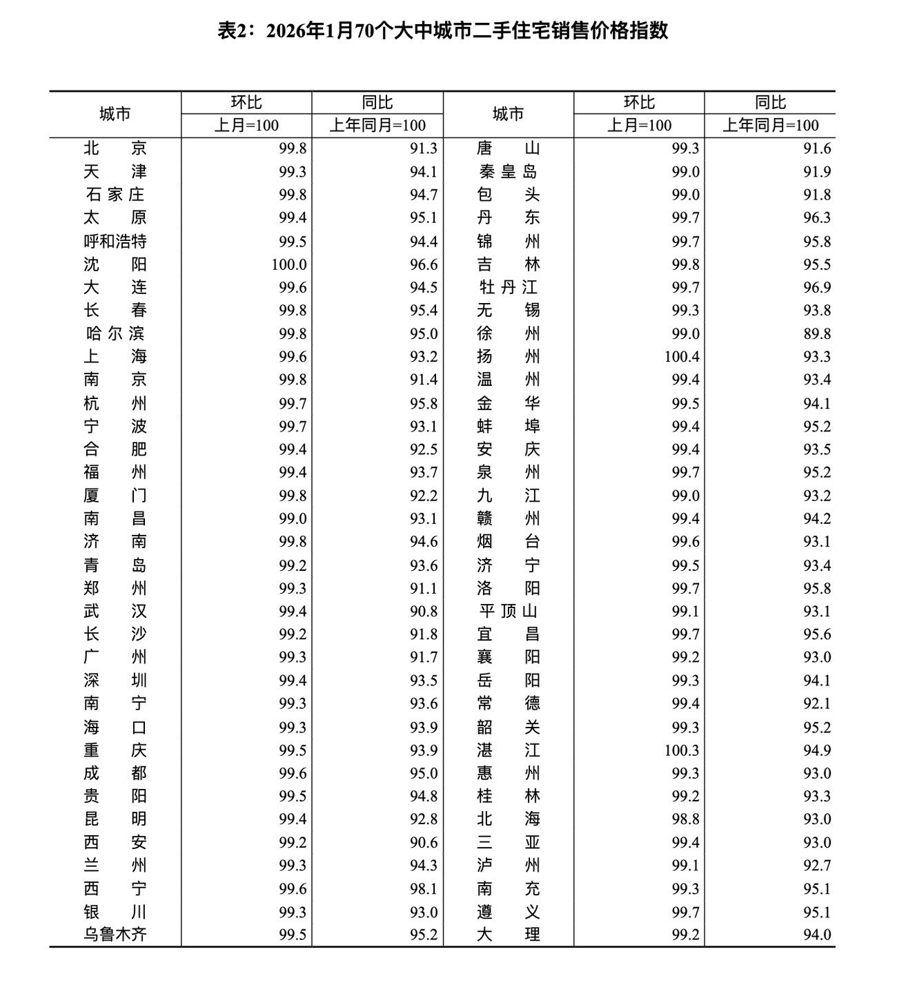 2 月 13 日,国家统计局公布的数据显示,2026 年 1 月份,70 个大中城市商品住宅销售价格环比降幅总体收窄、同比下降。
