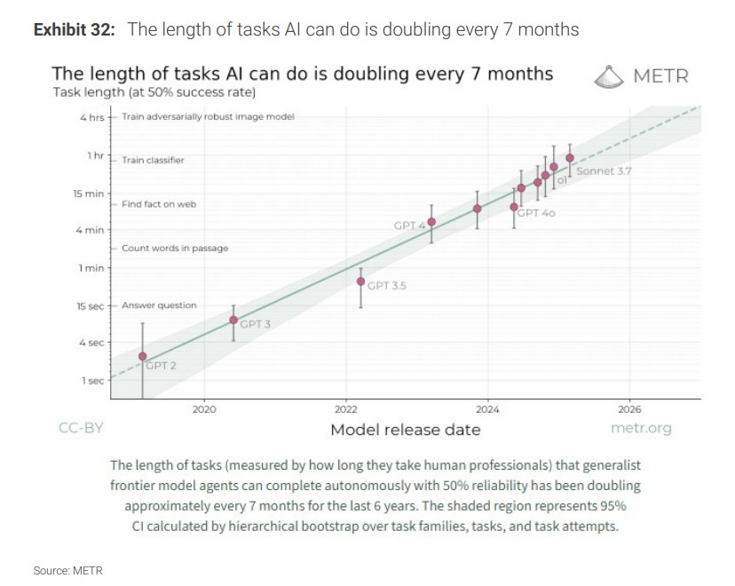 - 更關鍵的是,單個 LLM 查詢的計算強度正在快速上升。研究機構 METR 指出,AI 每次客户查詢所執行的"工作"平均時長每 7 個月翻一番。
